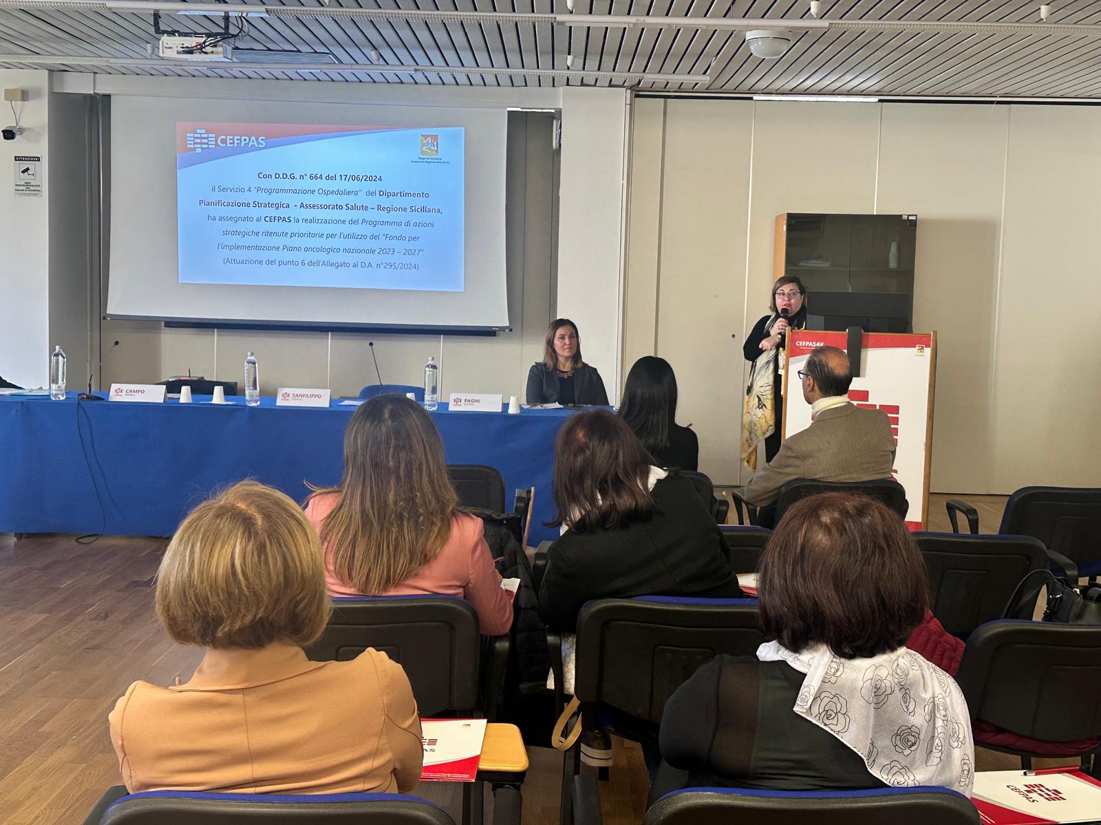 Il 19 dicembre si è tenuto, presso l’Auditorium Garsia del CEFPAS, il seminario “Implementazione del piano oncologico nazionale: il contributo delle associazioni nell’educazione alla salute e nel miglioramento dell’accesso alle cure, in ambito oncologico”, rivolto a una ventina di partecipanti tra operatori/volontari, pazienti oncologici e familiari, afferenti alle Associazioni regionali operanti in ambito oncologico. Ad aprire la giornata è stato il Direttore del CEFPAS, Roberto Sanfilippo, che ha ricordato l’importanza di equità e di accesso alle cure e l’urgenza di ridurre il fenomeno della mobilità passiva che porta il paziente a curarsi in altre regioni d’Italia. Presente anche il responsabile scientifico del progetto, Stefano Vitello, Direttore dell’UOC Oncologia Medica presso il Presidio Ospedaliero “Sant’Elia” di Caltanissetta e Referente Regionale del CIPOMO (Collegio Italiano dei Primari Oncologi Medici Ospedalieri) e Stefano Campo, Funzionario Servizio 4 “Programmazione Ospedaliera” del Dipartimento Pianificazione Strategica Assessorato della Salute della Regione Sicilia.
