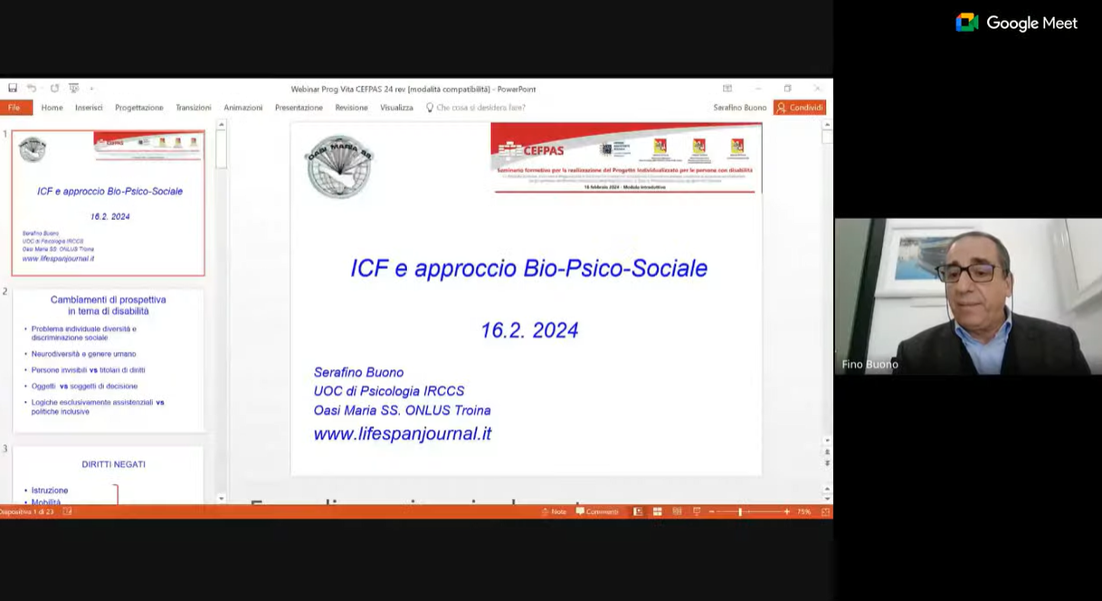 “Il 16 febbraio sulla piattaforma online del CEFPAS è stato presentato il Corso di formazione per la realizzazione del Progetto Individualizzato per le persone con disabilità, finalizzato a migliorare la qualità della vita, a dare alle persone con disabilità la possibilità di vivere una vita indipendente e con le stesse opportunità degli altri. Si tratta di un evento formativo di grande rilevanza per tutti i professionisti sanitari coinvolti che hanno competenze differenti, ma che sono orientati a un obiettivo condiviso ovvero quello di migliorare la qualità delle cure, la piena integrazione e inclusione sociale”. Queste le parole del Direttore del CEFPAS, Roberto Sanfilippo, in occasione della presentazione del Seminario formativo per la realizzazione del Progetto Individualizzato per le persone con disabilità, previsto dall’art. 14 della legge 8 novembre 2000, n. 328 “Legge quadro per la realizzazione del sistema integrato di interventi e servizi sociali”.