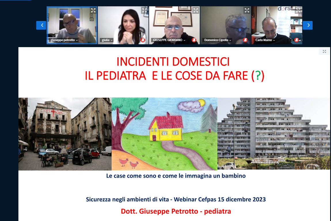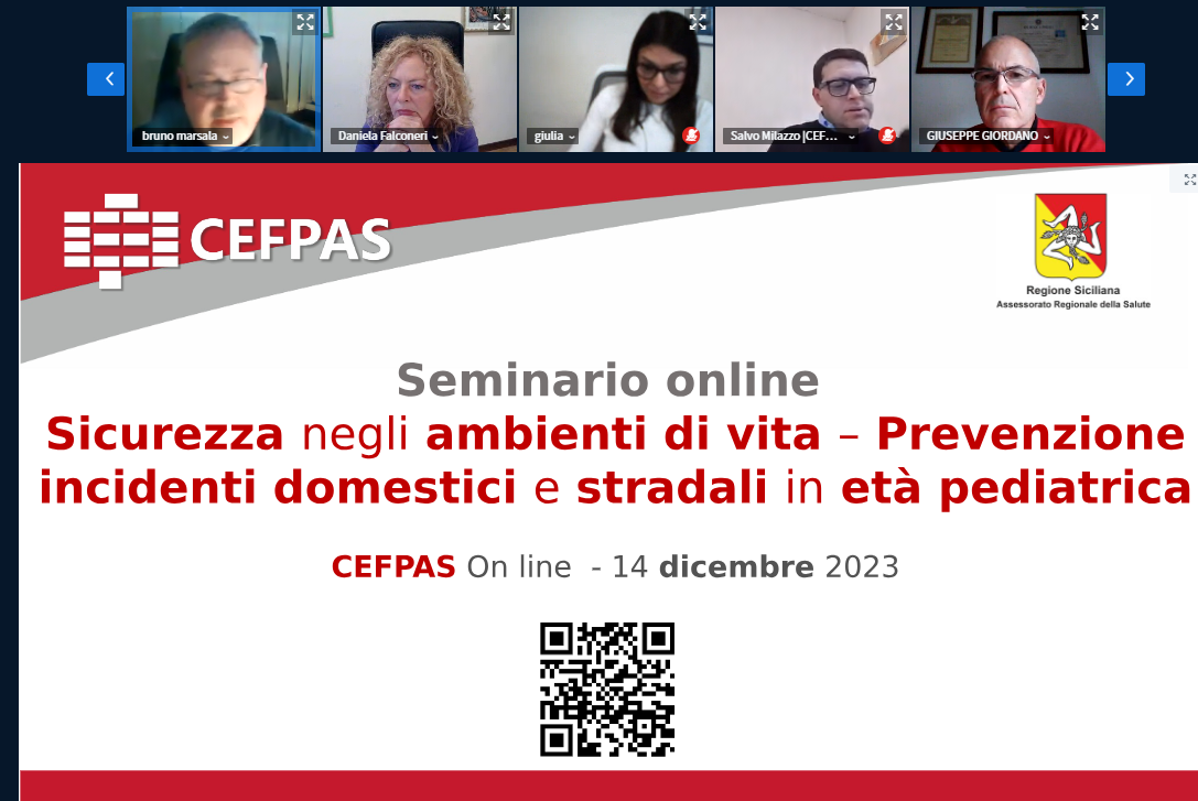 “Sicurezza negli ambienti di vita – Prevenzione incidenti domestici e stradali in età pediatrica” è il titolo del webinar che si è svolto il 14 dicembre in modalità videoconferenza su piattaforma e-learning CEFPAS. A fare i saluti è stato Franco Grasso Leanza, Dirigente del Servizio 5 “Promozione della Salute” del DASOE dell’Assessorato Regionale della Salute. Il Responsabile Scientifico del webinar è stato Bruno Marsala, Direttore U.O.C. Igiene Ambienti di Vita, Dipartimento di Prevenzione ASP Palermo.