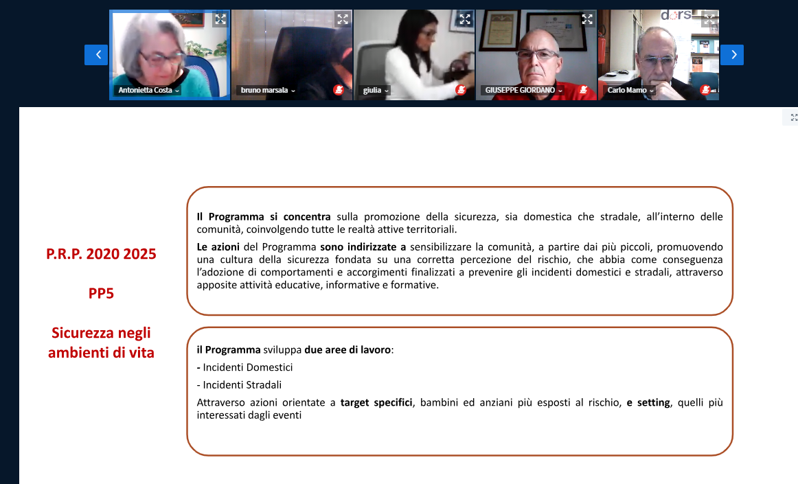 Degli overview sugli obiettivi specifici del PRP “Programma Predefinito 5” Sicurezza negli Ambienti di vita, ha parlato Antonietta Costa, Direttore F.F PTA Biondo, ASP Palermo e Responsabile scientifico del Piano Regionale della Prevenzione 2020/2025. Il Piano Regionale della Prevenzione è un macro processo di pianificazione che declina, nel contesto locale, strategia, interventi e azioni finalizzati a concorrere al raggiungimento degli obiettivi di salute che il Piano Nazionale della Prevenzione (P.N.P.) ha individuato sulla base delle priorità del Paese in sanità pubblica. Il sistema di programmazione, monitoraggio e valutazione che caratterizza il PNP e il PRP 2020-2025 rappresenta uno degli strumenti per dare attuazione e concretezza ai LEA “Prevenzione Collettiva e Sanità Pubblica”. Costa ha presentato i sei macro obiettivi del Piano: malattie croniche non trasmissibili, dipendenze e problemi correlati, incidenti stradali e domestici, malattie infettive prioritarie, infortuni e incidenti sul lavoro, malattie professionali; ambiente, clima e salute. Proprio il terzo macro obiettivo “Incidenti stradali e domestici” precisa come la prevenzione degli incidenti stradali richieda un approccio multisettoriale e il coinvolgimento di numerose istituzioni. Le azioni del Programma sono indirizzate a sensibilizzare la comunità, a partire dai più piccoli, promuovendo una cultura della sicurezza fondata su una corretta percezione del rischio che abbia come conseguenza l’adozione di comportamenti finalizzati a prevenire gli incidenti domestici e stradali, attraverso apposite attività educative, informative e formative.