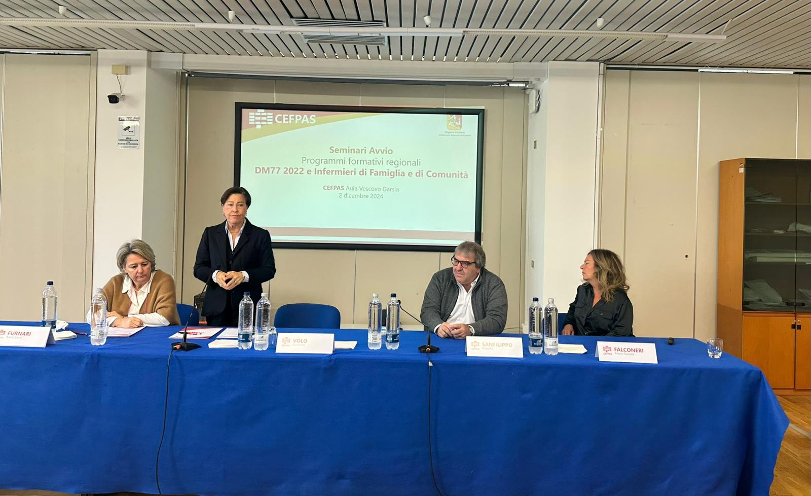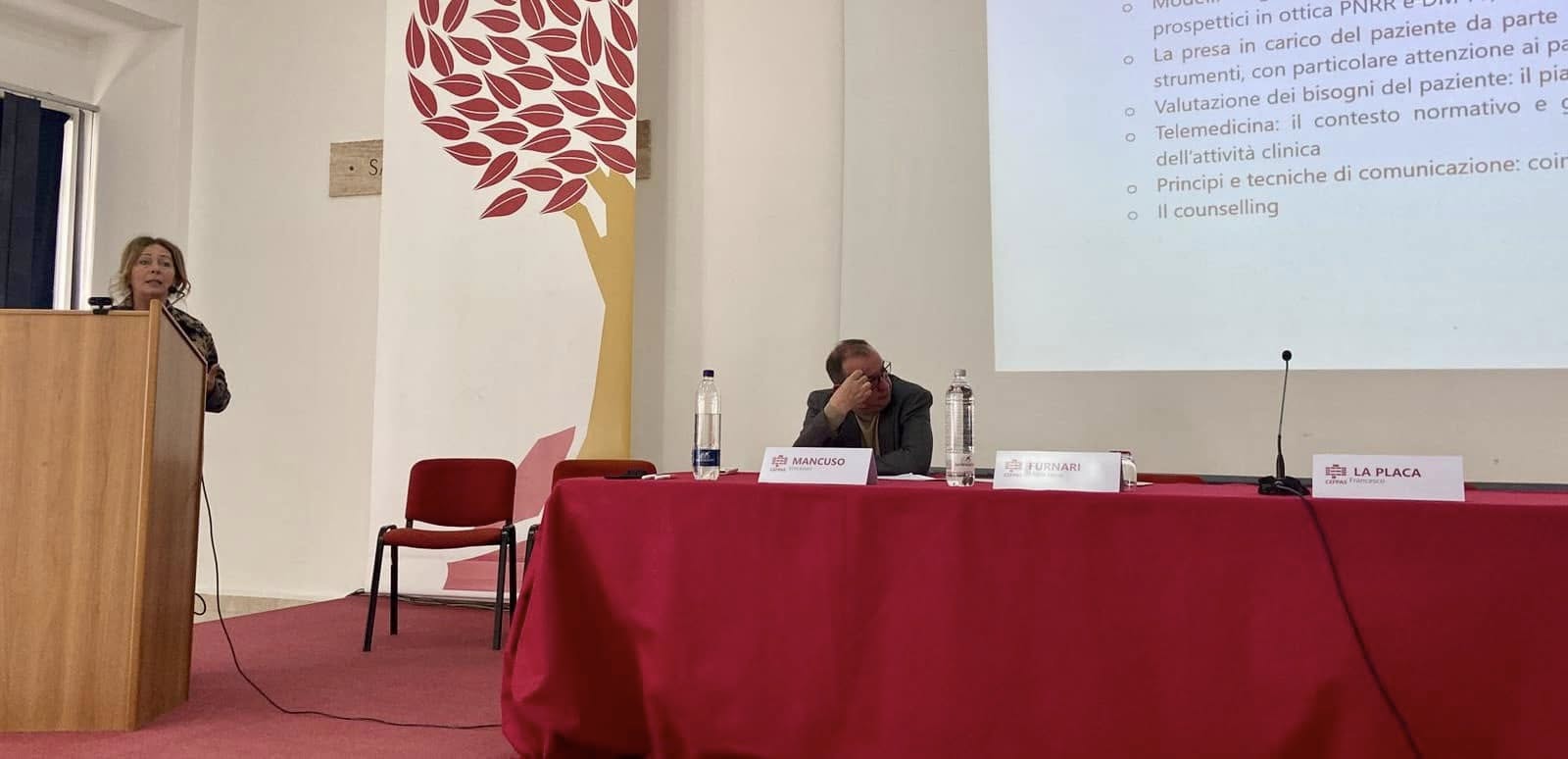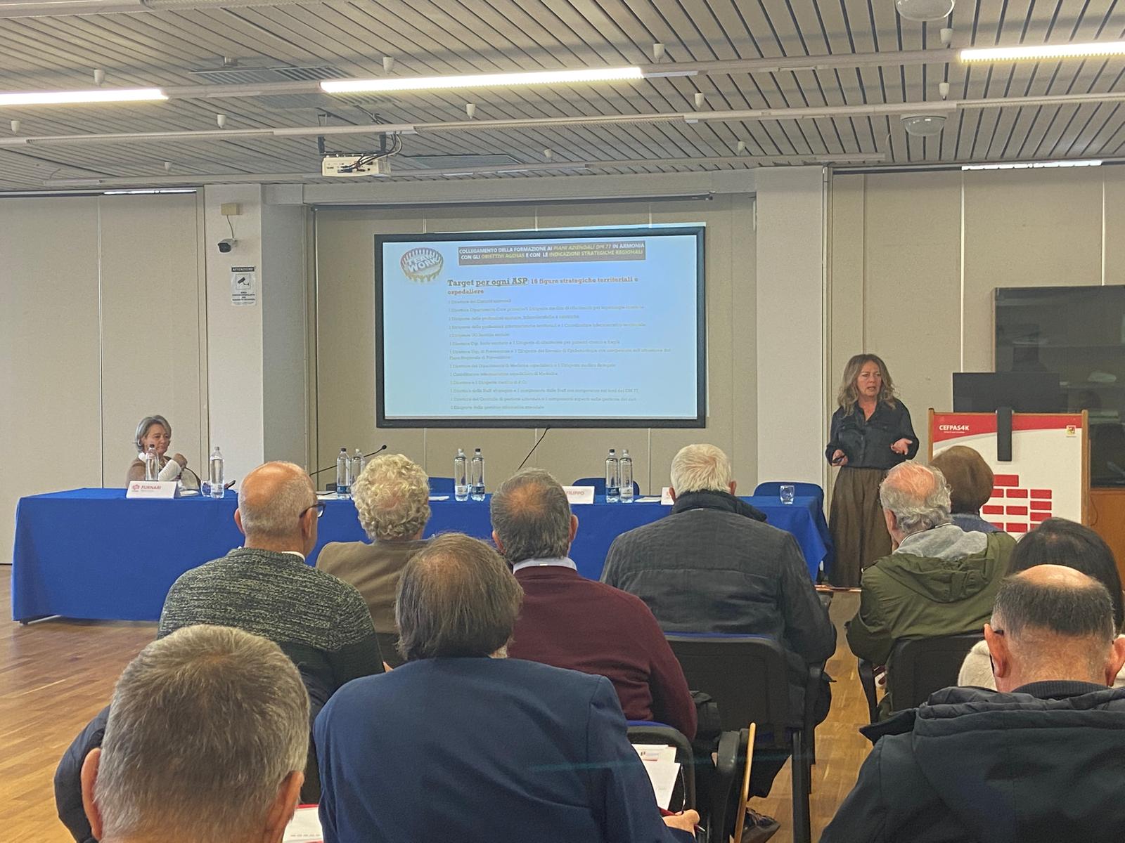 In occasione dell’avvio dei seminari relativi ai programmi formativi regionali sul DM 77 2022 e sugli infermieri di famiglia e comunità, ha preso la parola Roberto Sanfilippo, Direttore del Centro, che ha ringraziato l’assessore Volo per l’opportunità data al CEFPAS di organizzare le attività formative. Maria Lucia Furnari, Dirigente Servizio 2 Formazione DASOE Assessorato Regionale della Salute, ha aggiunto: “Oggi registriamo un reale interesse verso quello che possiamo considerare un cambio culturale e la Sicilia deve rispondere a questo arduo compito. Quella di oggi è una giornata importante perché partiamo con la formazione, è necessario formare 15 mila persone con i fondi PNRR, altrimenti tali fondi andranno persi”. Durante la presentazione del Programma regionale di Formazione DM 77/2022 rivolto ai Direttori di Distretto, che si è svolta oggi, sono intervenuti anche: Francesco Paolo La Placa, Dirigente Servizio 8 Programmazione Territoriale DPS Assessorato Regionale della Salute, Daniela Falconeri, Coordinatore progetti formativi DM77 – CEFPAS , Giuseppe Noto, Responsabile Scientifico Programmi formativi per Direttori di Distretto e Team aziendali DM 77/2022, Vincenzo Mancuso, Responsabile Scientifico Programma IFeC e Paola Sciarrotta, Servizio 8 DPS Assessorato Regionale della Salute.